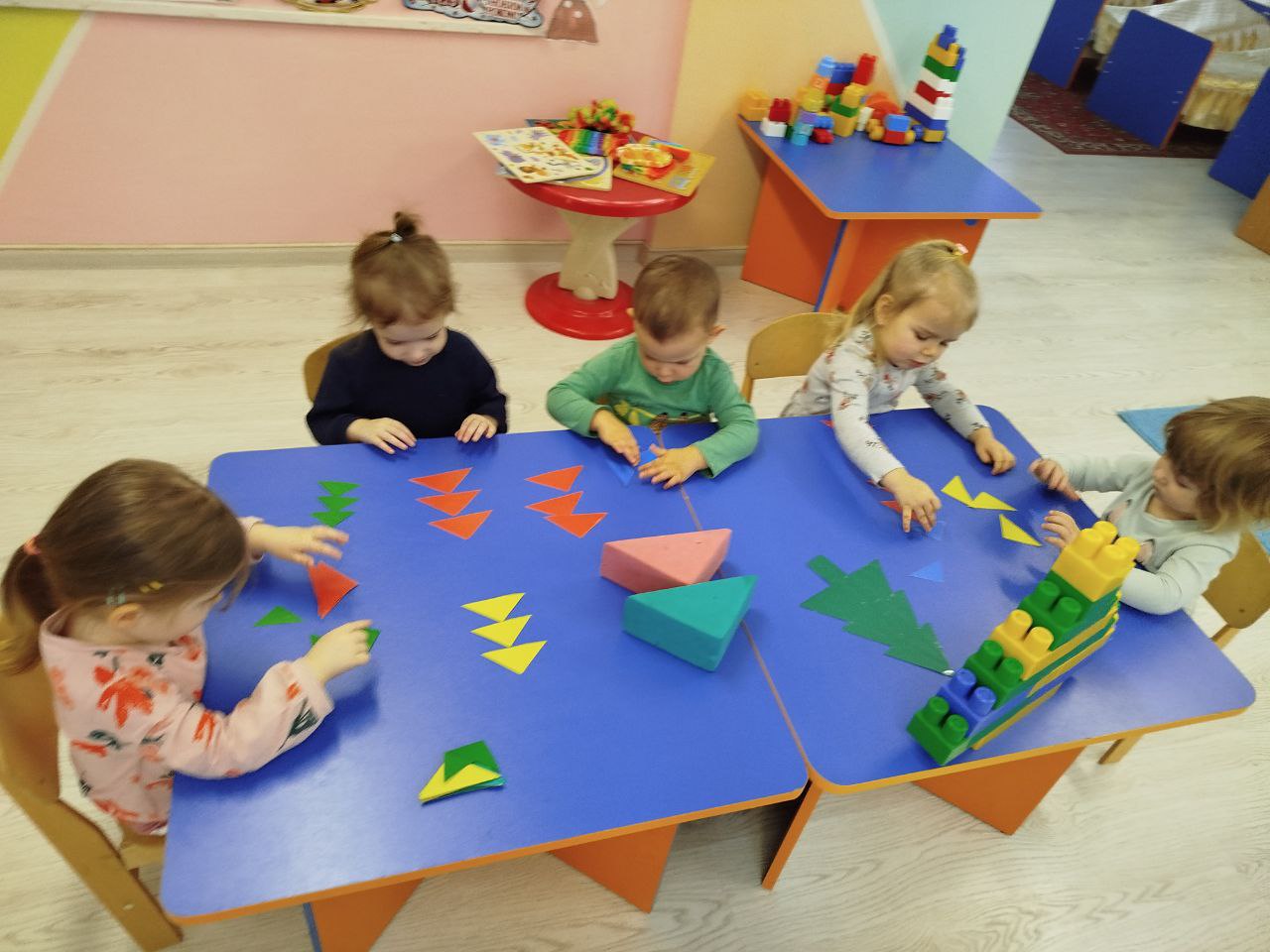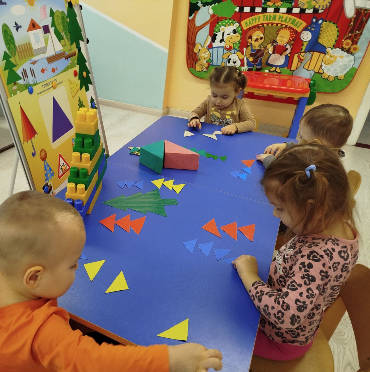 Діти вчилися складати ялинку з геометричних фігур, закріплювали знання про форму «трикутник», розвивали просторове мислення, дрібну моторику та увагу. Кожна ялинка вийшла унікальною — як і фантазія наших малюків